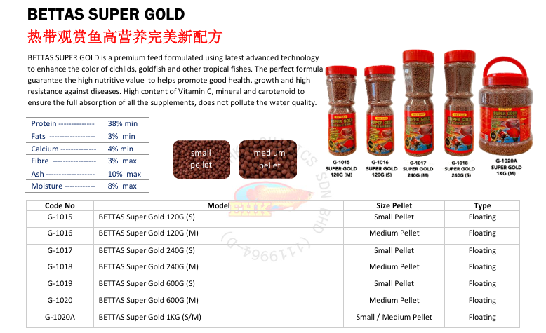 BETTAS SUPER GOLD is a premium feed formulated using latest advanced technology to enhance the color of cichlids, goldfish and other tropical fishes. The perfect formula guarantee the high nutritive value to helps promote good health, growth and high resistance against diseases. High content of Vitamin C, mineral and carotenoid to ensure the full absorption of all the supplements, does not pollute the water quality.